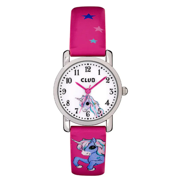 Analog barneklokke fra Club med lyserosa silikonrem og enhjørningmotiv. Klokken har sølvfarget kasse og hvit skive med arabertall og mineralglass. Den måler 27mm. Klokken er vanntett til 30 meter og tåler kun lett vannsprut.