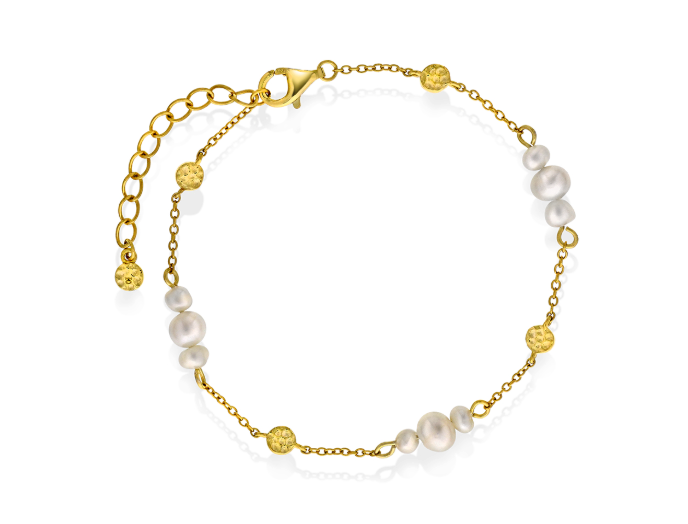 Nydelig armbånd med ferskvannsperler på rad i flott kombinasjon med forgylt plate.