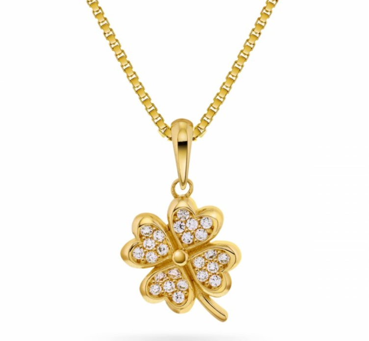 Gullsmykke firkløver med sølvforgylt kjede i 42 cm.
