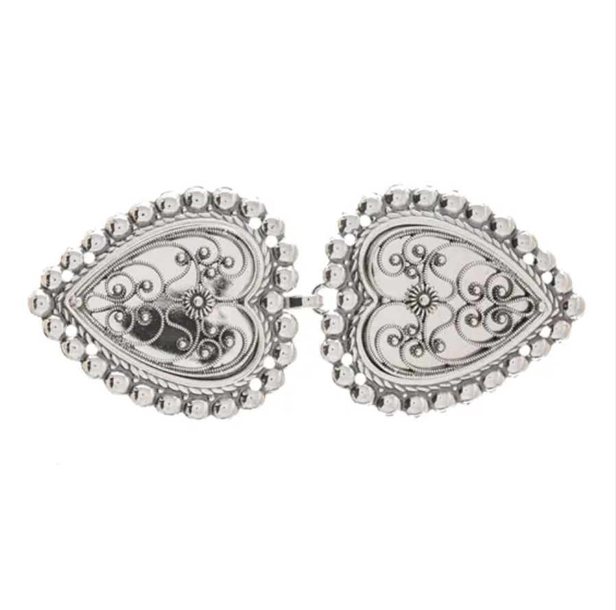 Hjertespenne til grafferbunad i oksidert sølv med øsken og syhull.