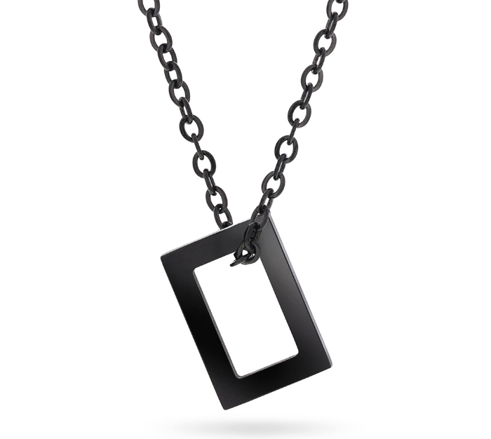 Tøft sort stålsmykke med anheng som en hengende firkant. Stilig å bruke sammen med andre smykker. Leveres med sort stålkjede, lengde 52 cm. Finnes i flere farger.