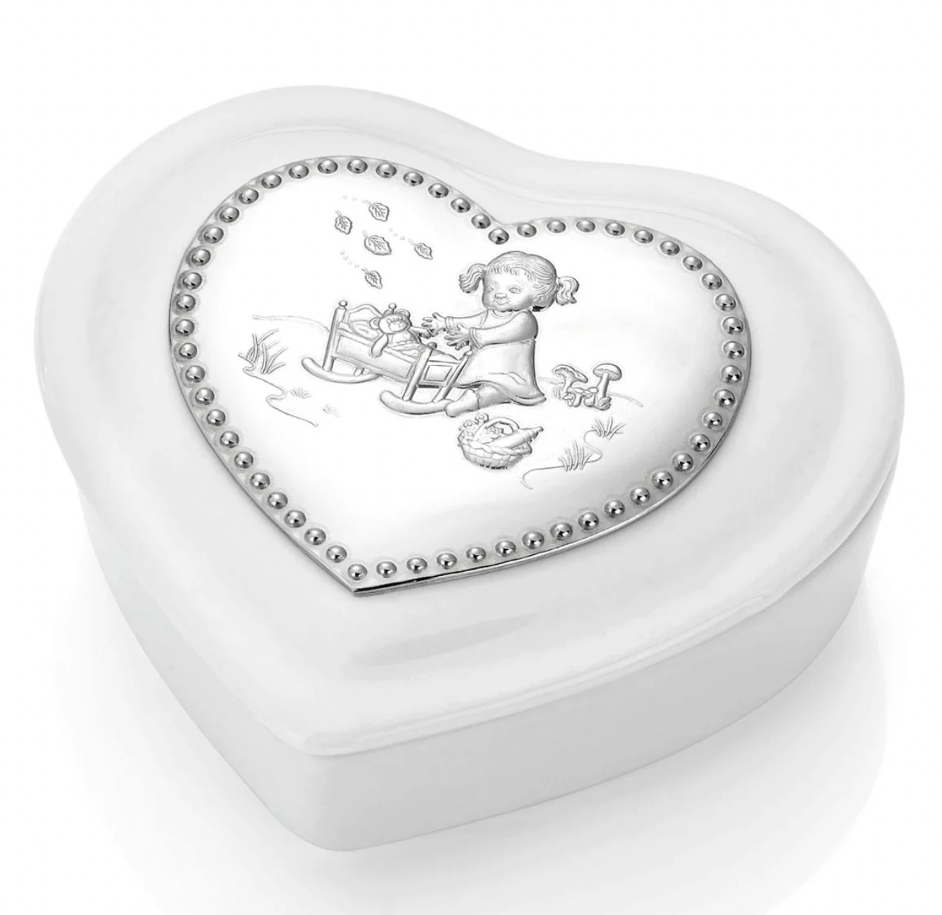 Lite smykkeskrin porselen med dekor i ekte tinn. Innlegg i mørk blå velur. Tinndekoren kan graveres med navn og dato.