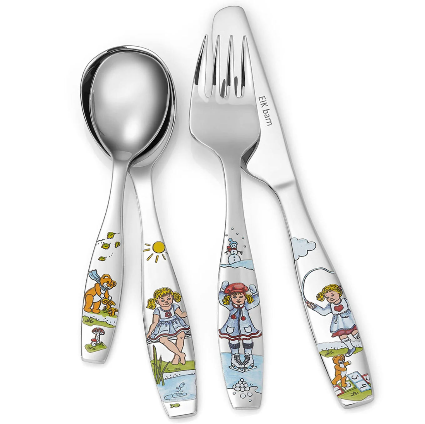 Barnebestikk i stål i fire deler. Består av kniv, skje, gaffel og babyskje. Tåler oppvaskmaskin.