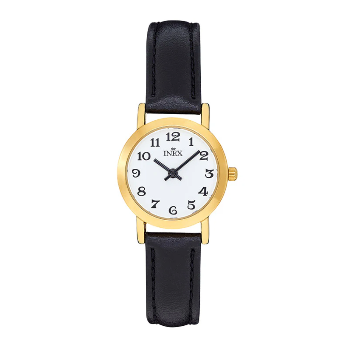 En petite klokke fra Inex med sort rem og hvit skive. Kassen er laget av gullfarget stål. Klokken er 24mm.