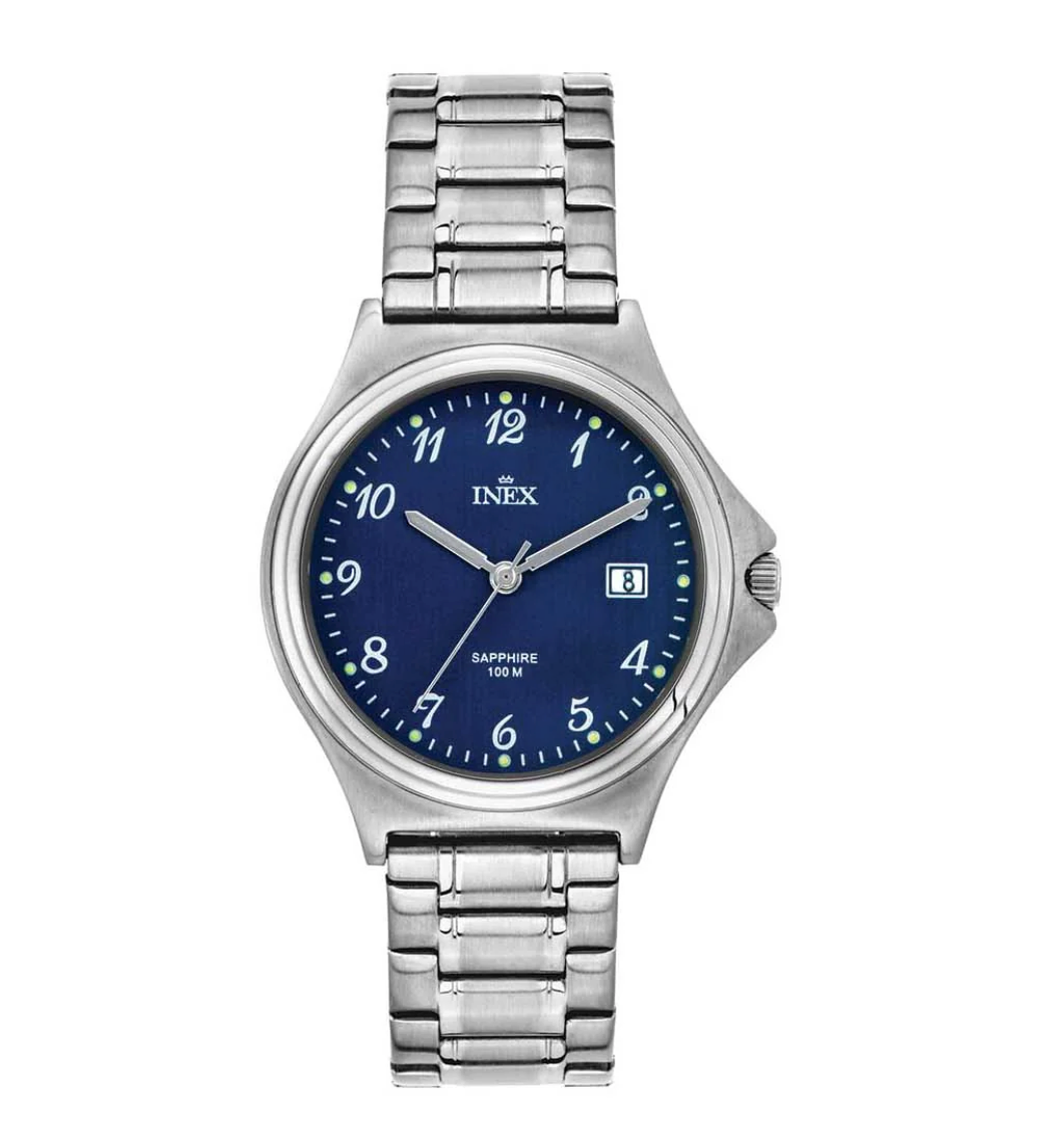 En stilig klokke fra Inex til herre med blå skive og safirglass. Den er drevet av et quartz verk og er 100 meter vanntett.