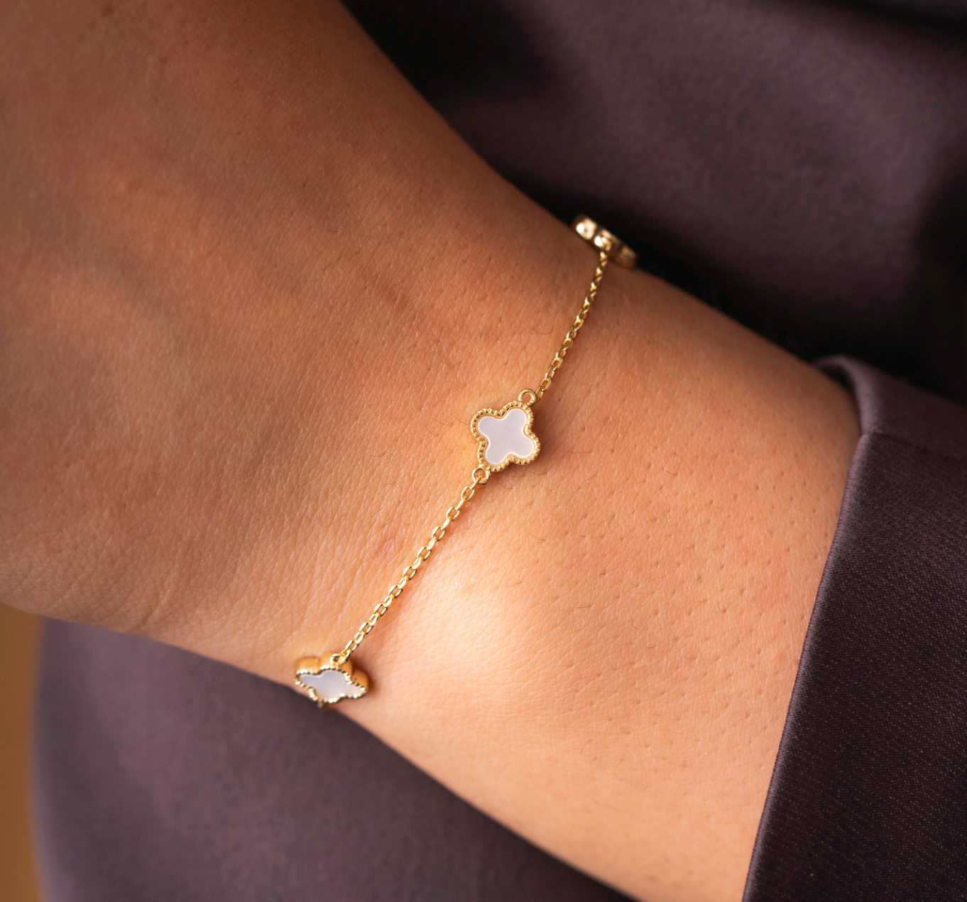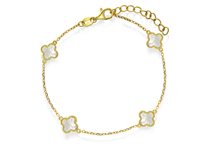 Det populære kløverarmbåndet med hvit kløver og gullforgylt sølv.