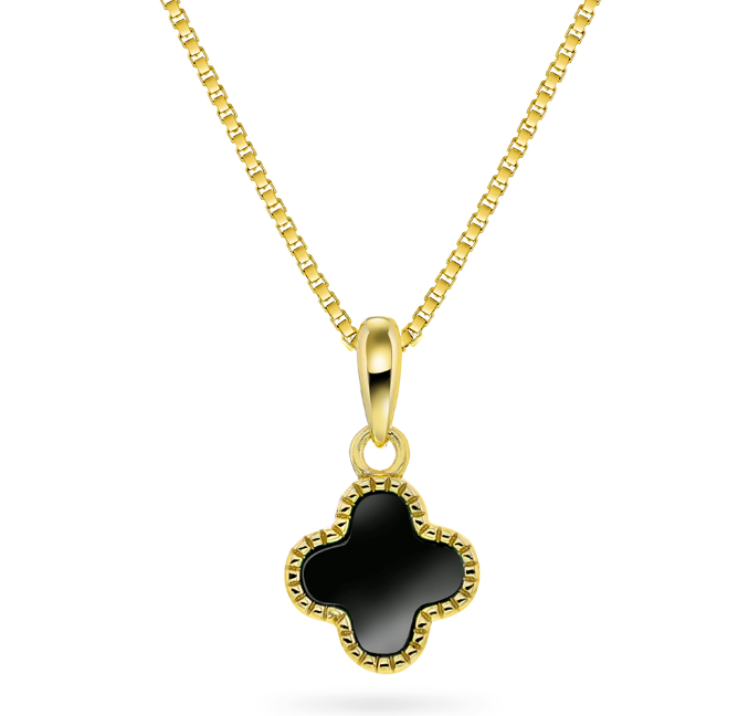 Pan Jewelry, Kløver smykke i 925 forgylt sølv med sort kløver og 42 cm gullforgylt kjede.