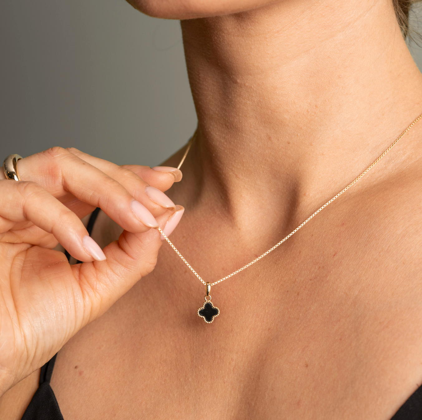 Trendy smykke med klassisk sort kløver med syntetisk sort agat. Kommer også i tilhørende armbånd og øredobber, samt i flere farger.