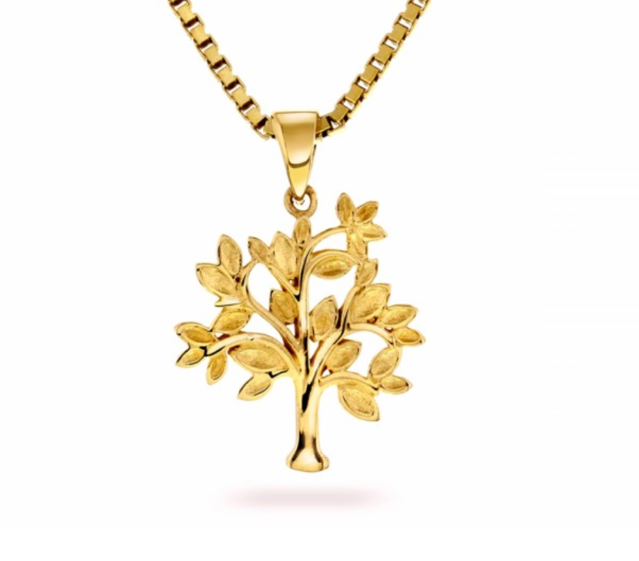 Livets tre smykke i 14 karat gult gull. Kjedet som følger med er i forgylt sølv.