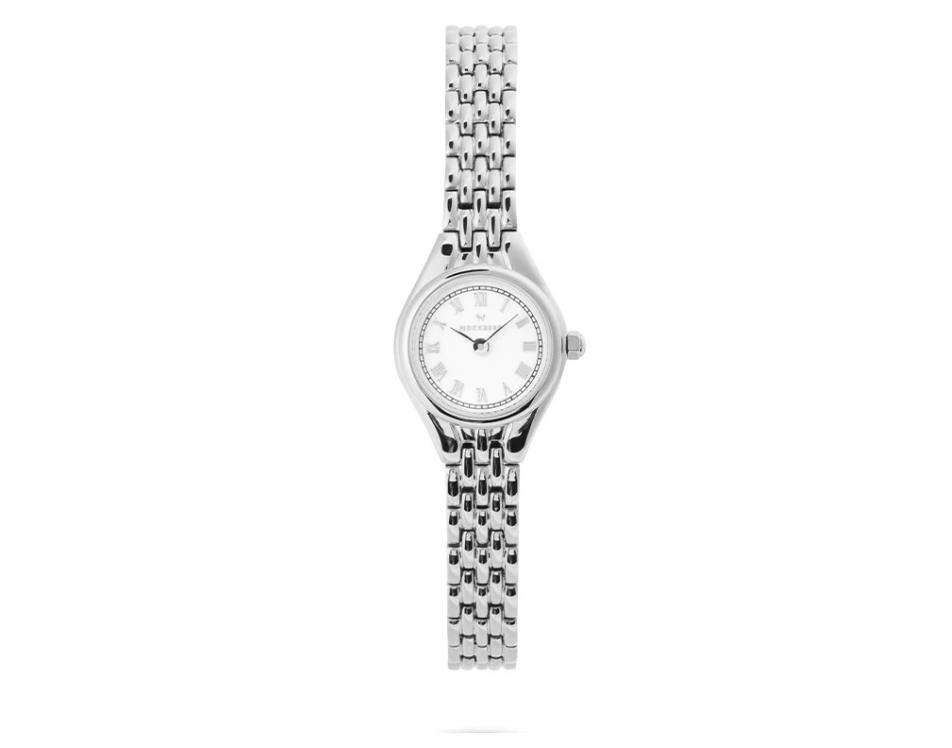 Heritage er en elegant dameklokke med klassisk design og kompakt størrelse. Klokken har en hvit urskive med romerske tall, ripe- og støtsikkert mineralglass og et slankt lenkearmbånd i rustfritt stål.