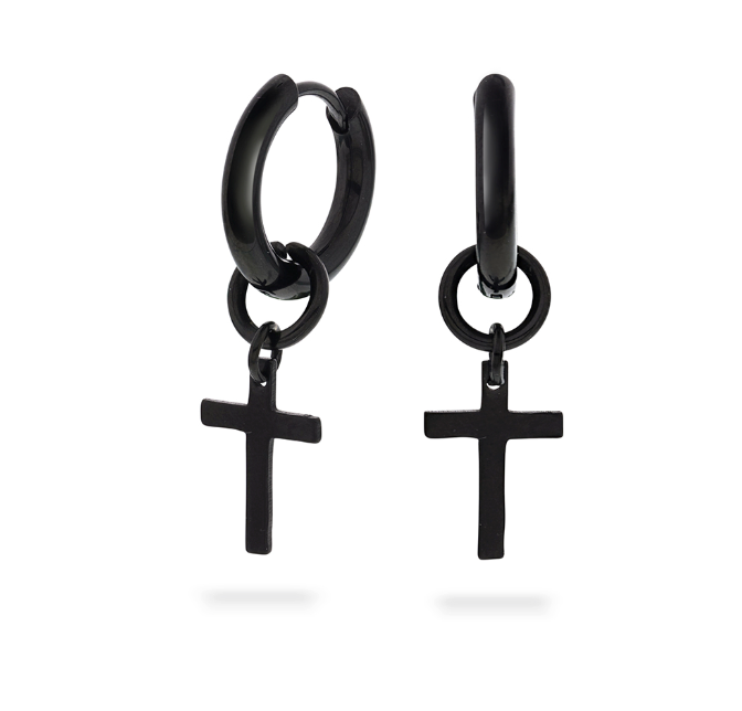 Tøffe øreringer med hengende kors i sort stål. Hengende kors kan taes av øreringen og du kan bruke de kun som øreringer også. Leveres som ett par. Finnes i flere farger.