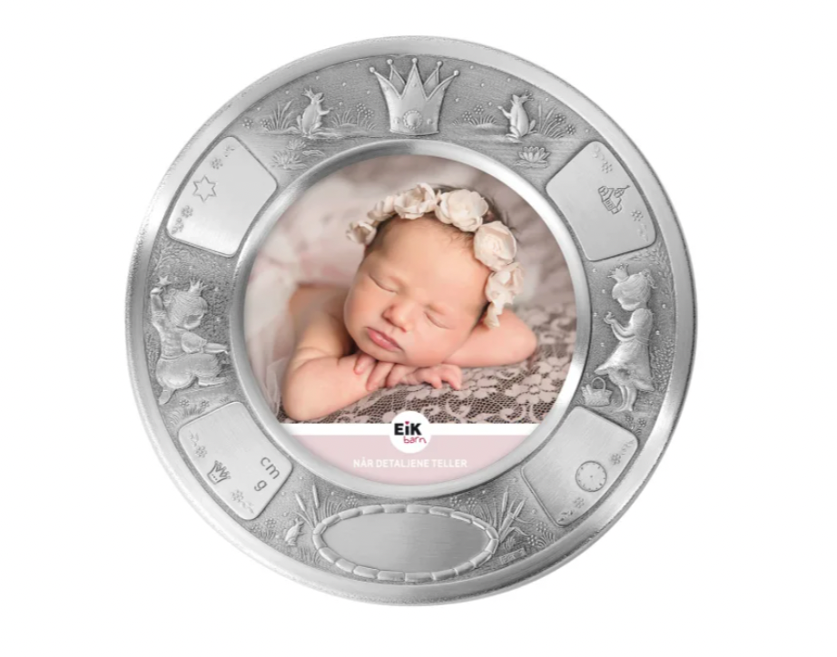 Rund fotoramme i ekte tinn med prinsessemotiv. Felter til gravering av alle fødsels- og dåpsdata.