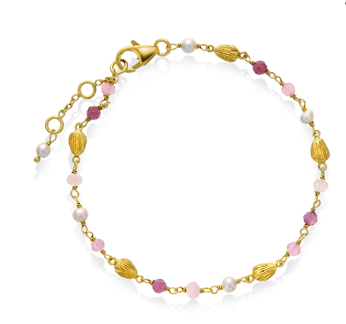 Det nydeligste armbåndet i duse rosafarger med stener av ekte jade, rosenkvarts, turmalin og hvite ferskvannsperler. Armbåndet er 16 cm langt og har en forlenger på 3 cm så det kan justeres til ønsket lengde. Finnes i matchende smykke.