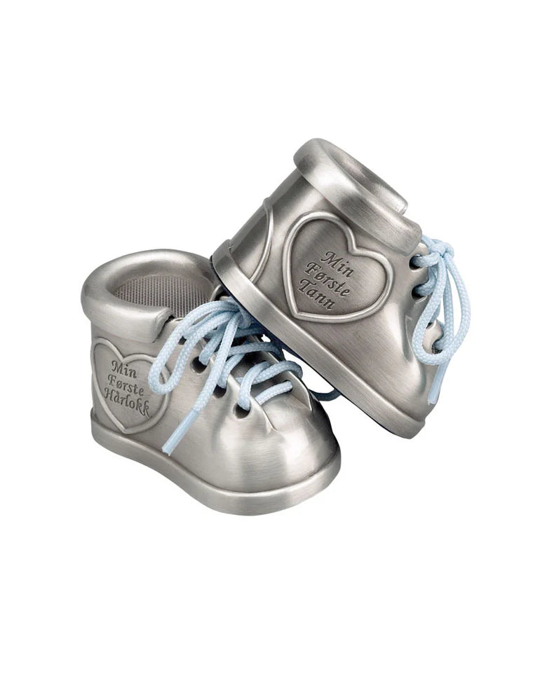 Fortinnet sko "Mine Første" skrin. Produktet kan graveres. Mål: 6 x 4 x 3,5 cm