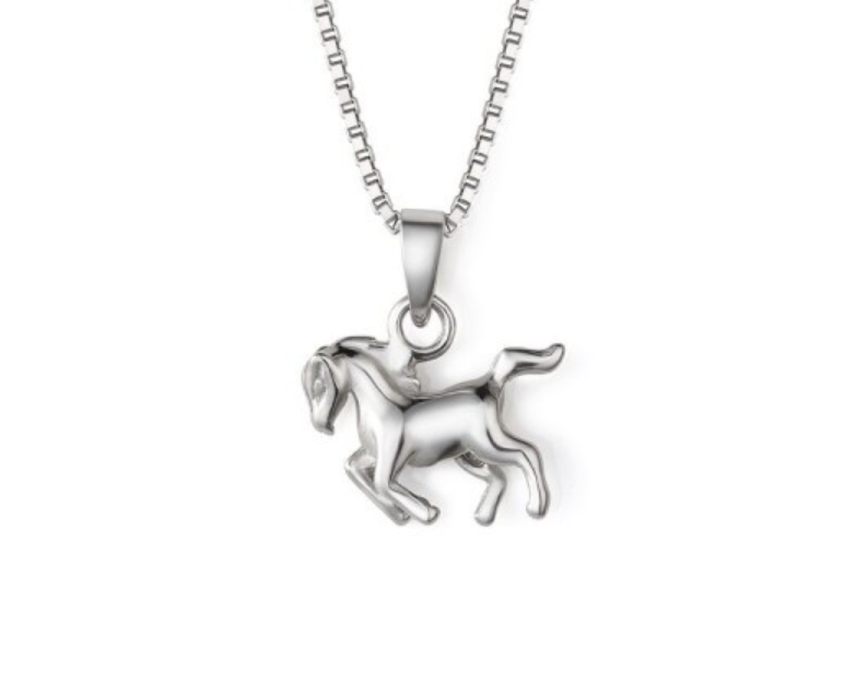 Liten hest i rhodinert 925 sølv. Anhenget leveres med 27 cm rhodinert sølvkjede.