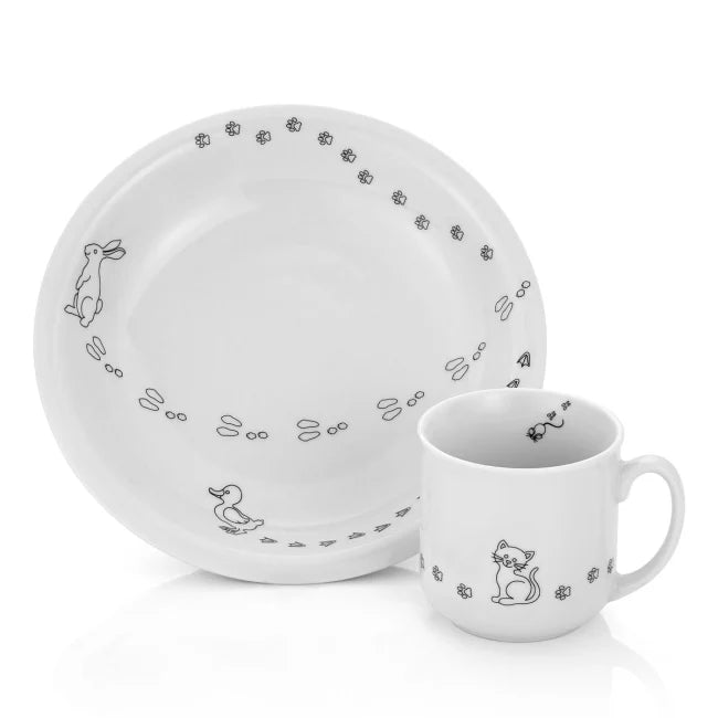Porselenssett i to deler. Består av grøtskål og krus. Tåler oppvaskmaskin.