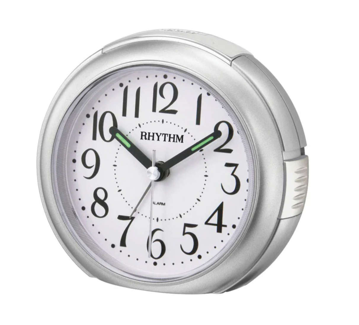 En enkel grå vekkerklokke fra Rhytm. Denne klokken har funksjoner som bip alarm, snoozefunksjon, lys og svepende visere. Rammen er laget i plast og klokken måler 9,7 x 9 x 5 cm.