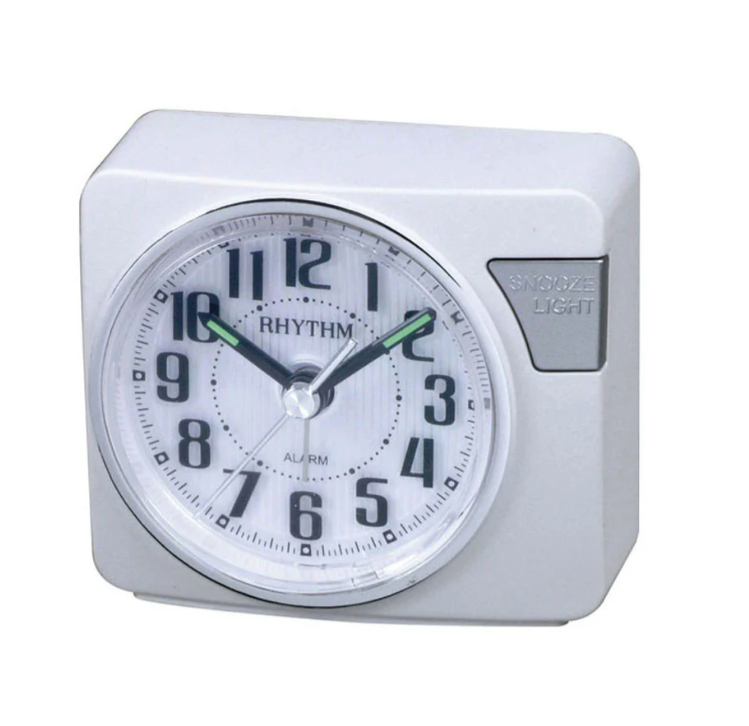 En enkel hvit vekkerklokke fra Rhytm med bip alarm, snoozefunksjon, lys og svepende sekundvisere. Rammen er laget i plast og klokken måler 8,5 x 8,3 cm.