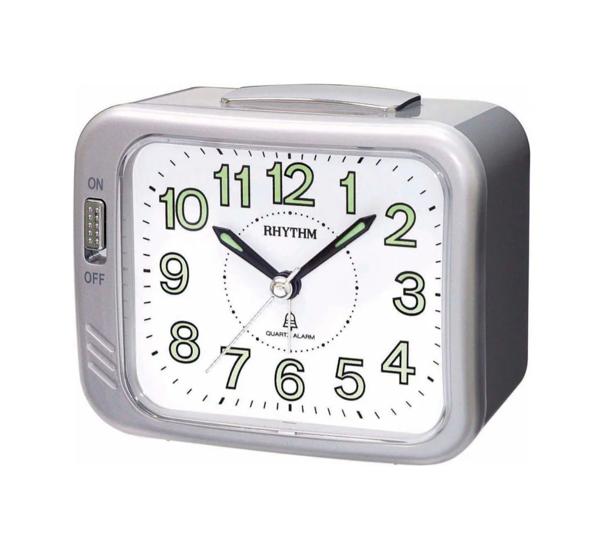 Sølvfarget vekkerklokke med hvit skive og tydelige tall. Denne klokken har funksjoner som bjelle alarm, snooze, lys og svepende visere. Rammen er laget i plast.