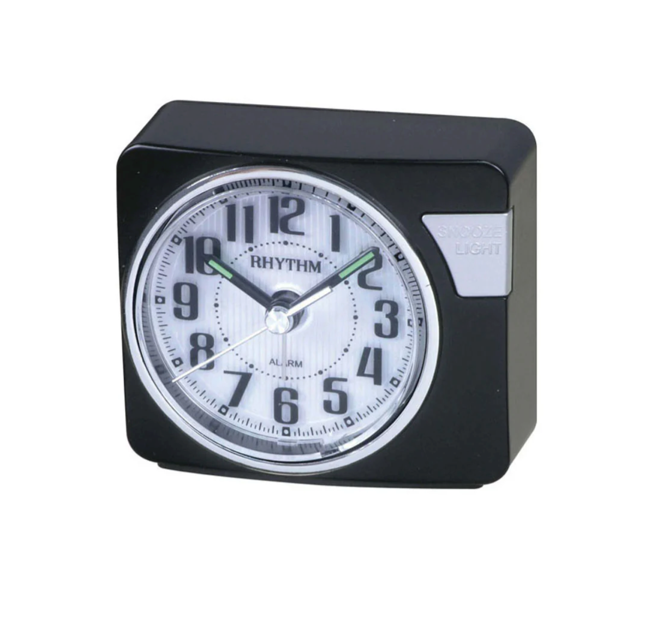 En enkel sort vekkerklokke fra Rhytm med bip alarm, snoozefunksjon, lys og svepende visere. Rammen er laget i sort plast og urskiven er hvit.
