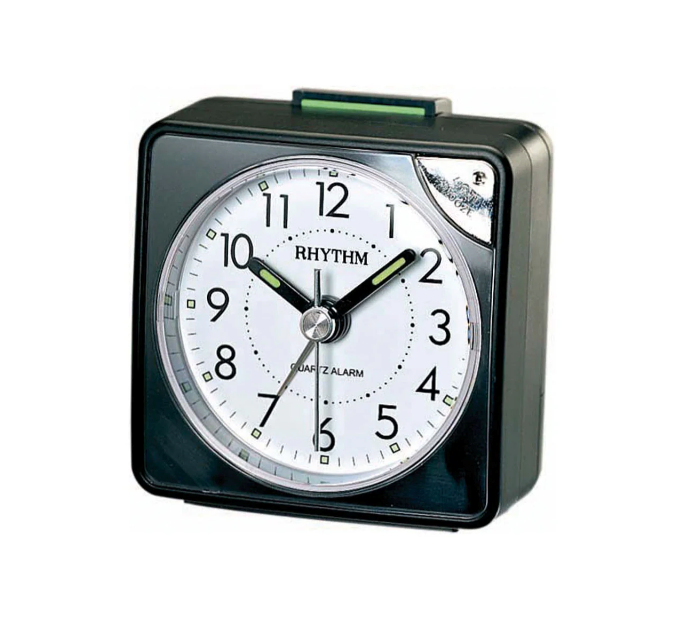 En enkel sort vekkerklokke fra Rhytm med stigende bip alarm, snoozefunksjon og lys. Rammen er laget i sort plast og klokken har en hvit bakgrunn.